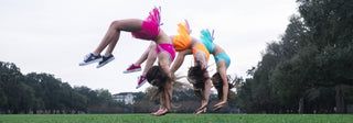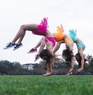 Rebel cheer shoes danging down by laces onto puple background. 2 white cheer shoes one black cheer shoe