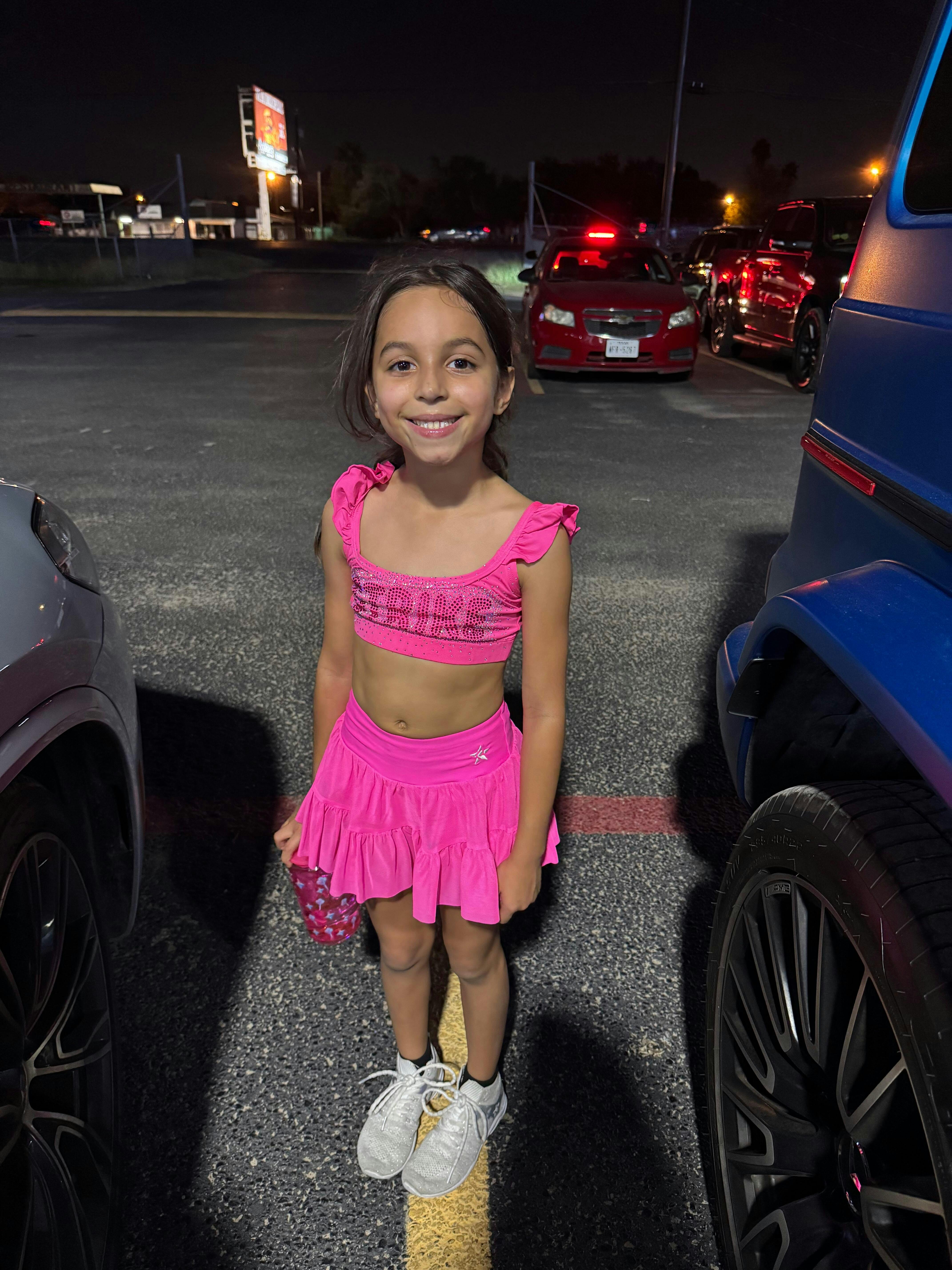 Runs a bit big and long but its so cute. Love the bright pink to it. For reference she wears ys and we sized down to yxs.