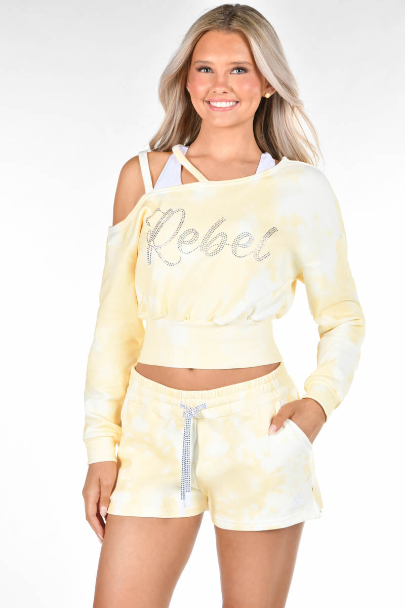 Elevate your Rebel lounge wear in the Golden Breeze Off-The-Shoulder Top! This cropped, relaxed pullover features a chic cold-shoulder cut with double shoulder straps and a sparkling crystal logo. Crafted in soft Fleeceluxe, it’s the ultimate mix of luxe comfort and holiday-ready shine.
