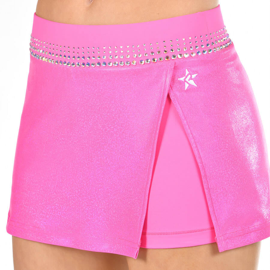 All eyes on YOU. The Mystique Muse Skirt in Electric Pink takes performance glam to a whole new level with a sparkling crystal mold and a chic front slit that shows off the compression short underneath. Perfect for twirling, tumbling, or taking over the stage… this skirt is pure main-character energy.