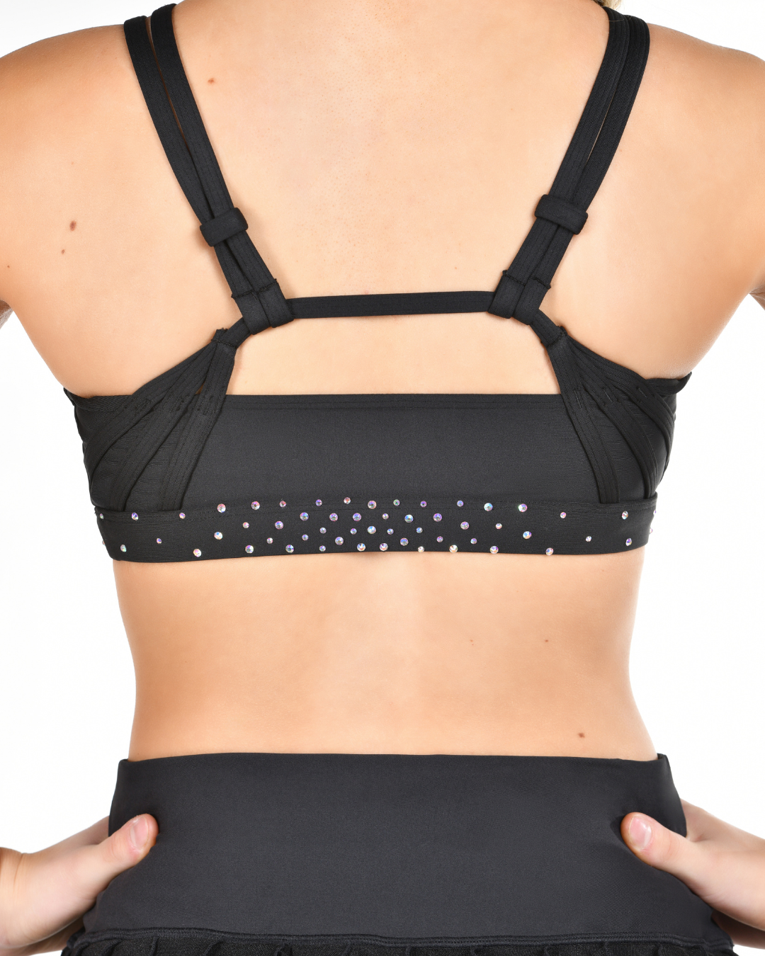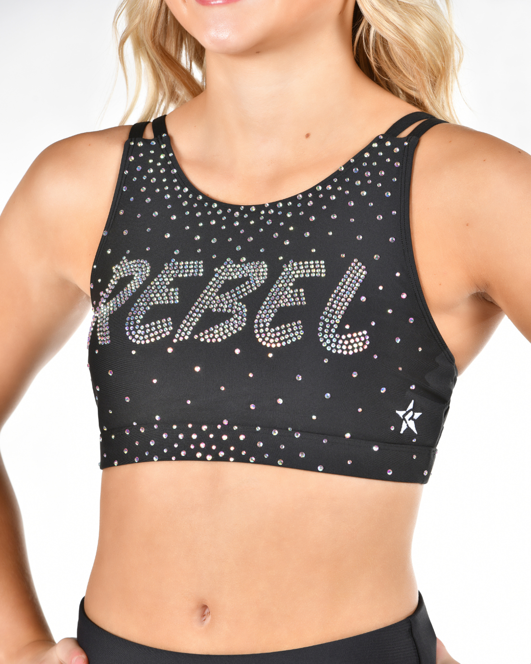 Shine bright under the holiday lights in the Rebel in Lights Sports Bra in Black! With a sleek scoop neckline and a strappy, shimmering back, this bra features bursts of crystals that sparkle with every move.