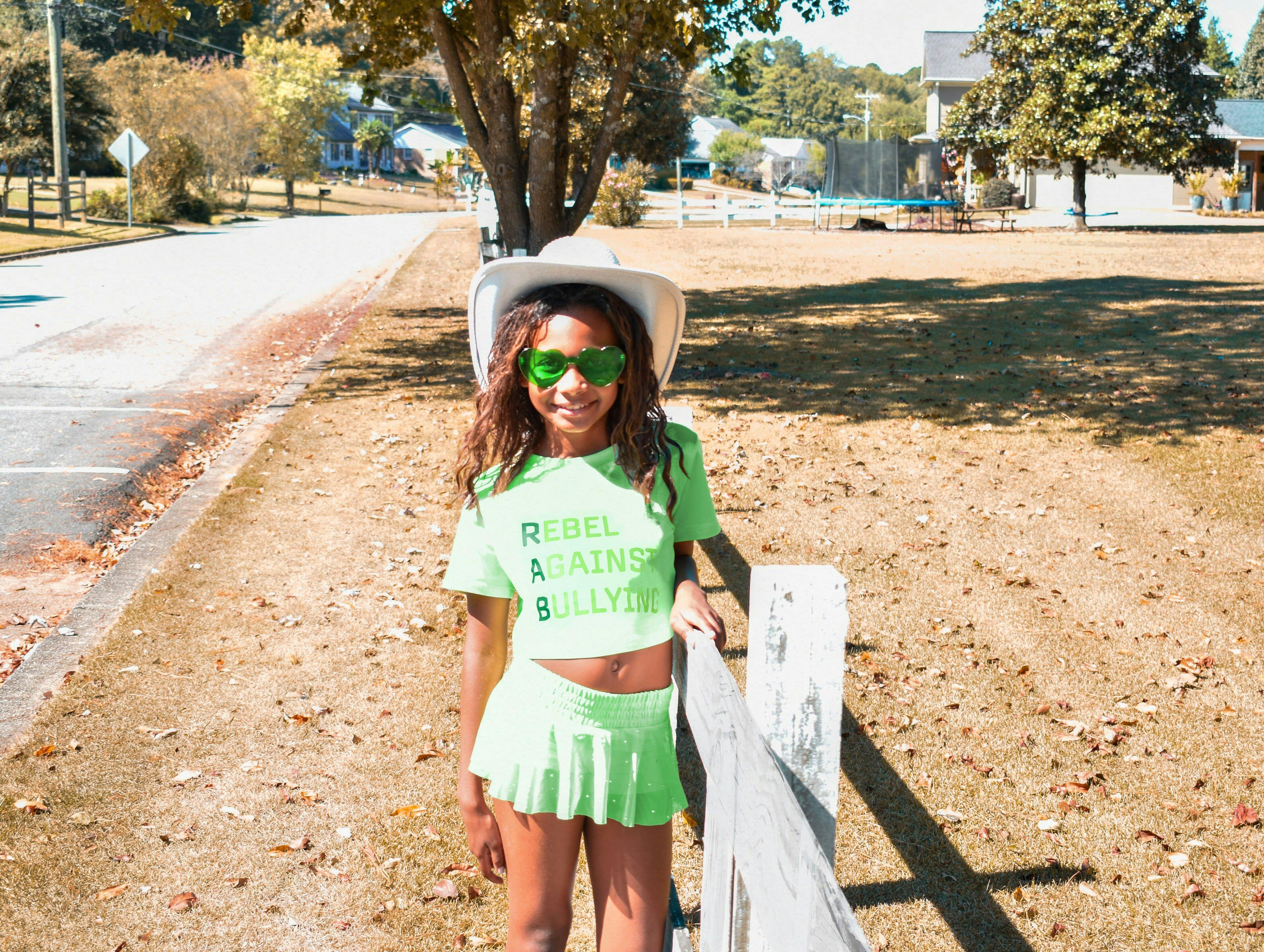 This is the perfect tee to support bullying and kindness, is pistachio color that match my pistachio skort. I love to support this.