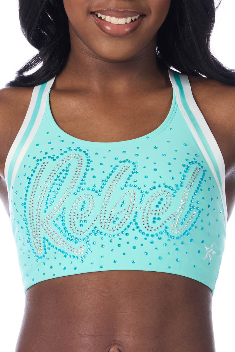 The Claire Sports Bra in Light Aqua is ready to hit the mat thanks the bold contrast colors, sparkly crystal burst and crystal logo fill. Performance-ready but make it fashion. Duh.