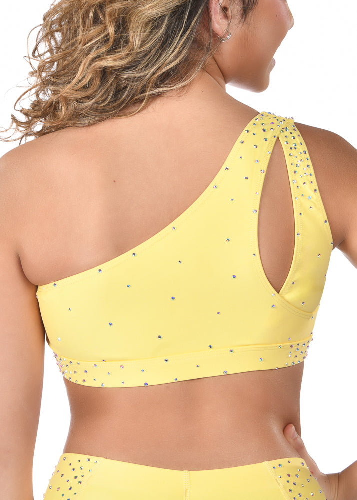 Step into a fairytale with the Elsa Sports Bra! This asymmetrical, one-shoulder design features a sparkling crystal burst along the shoulder and bust band, making every move magical.