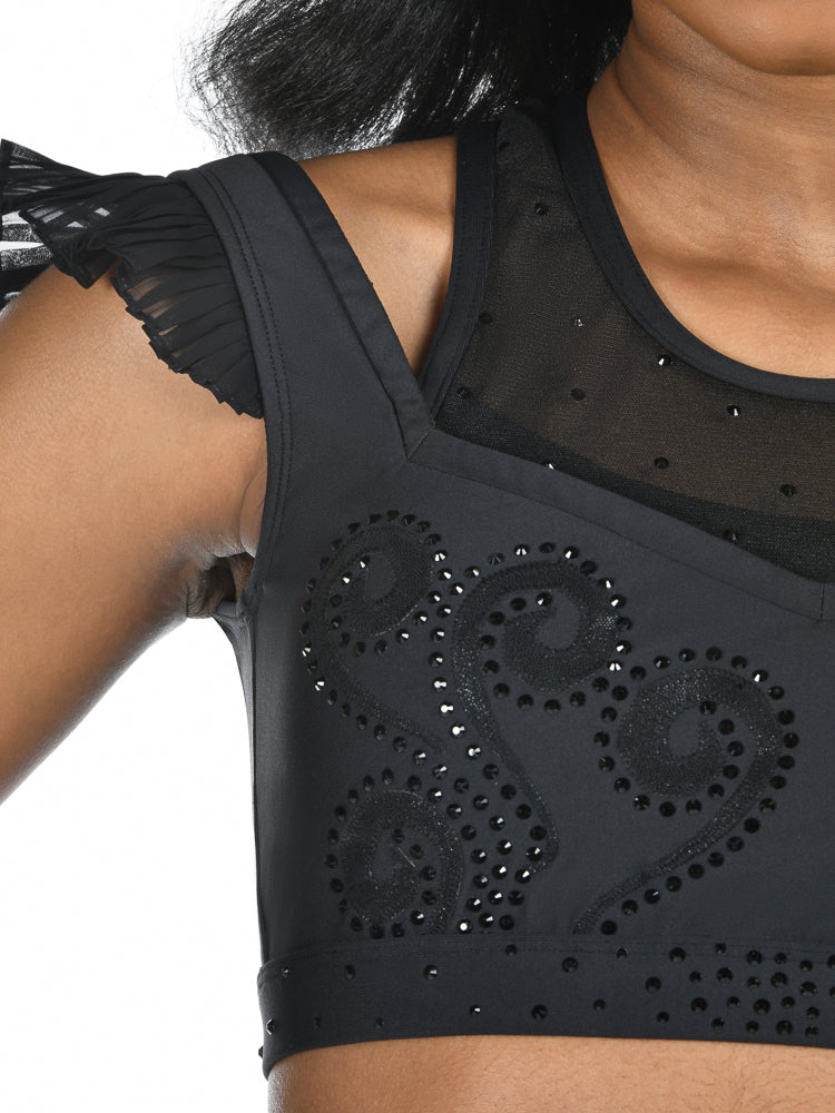 Dare to dazzle in the Flying Solo Sports Bra in Spellbound! Featuring a mesh overlay neckline, swirling appliqués, and dazzling crystal accents, this bra was made for a dramatic entrance.