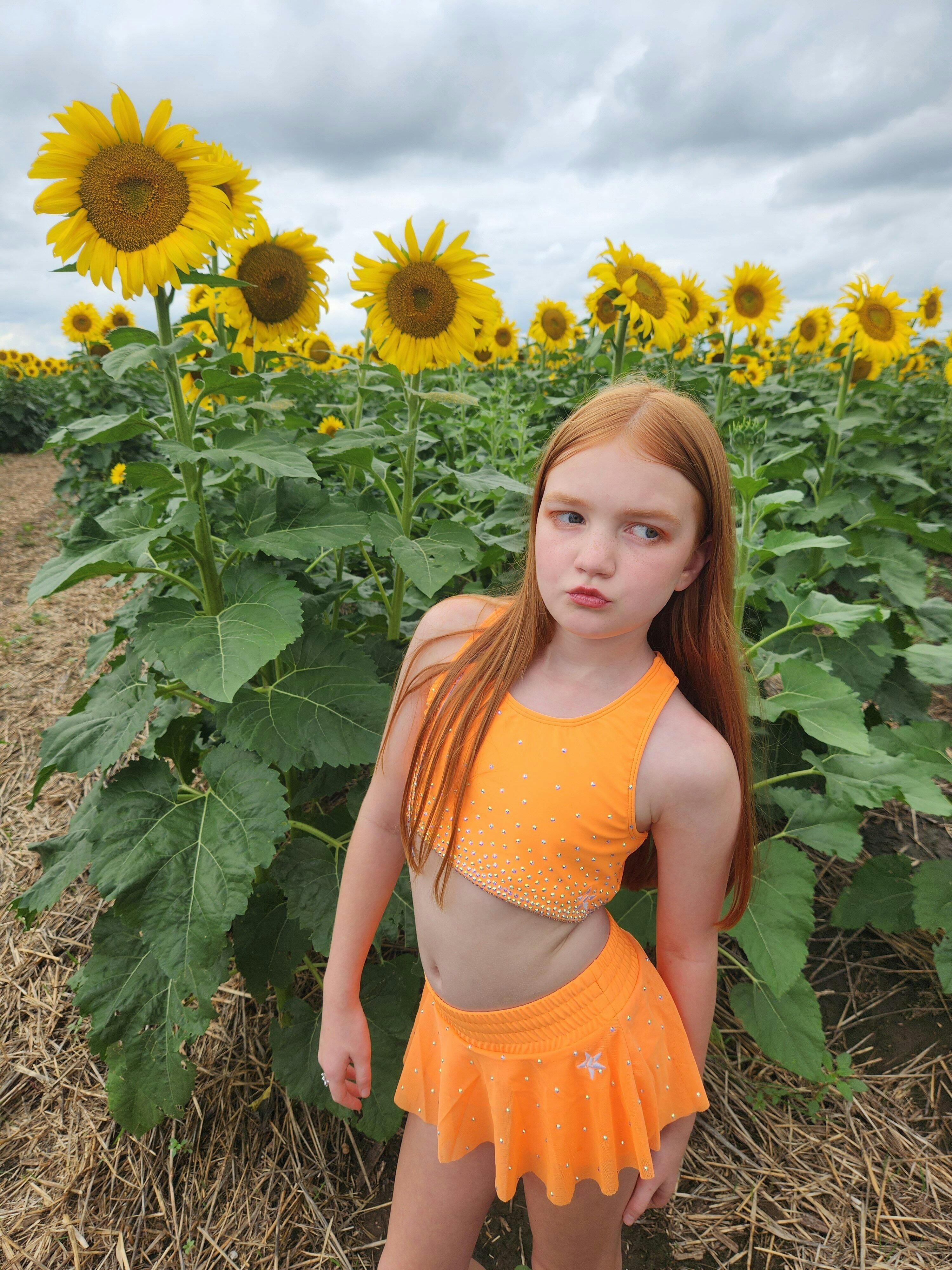 The On the Go Sports Bra in Tangerine Crystal AthleticFlex is the perfect staple sports bra for layering and mixing and matching. It features all-way stretch and a high compression level with just enough sparkle to make a statement.